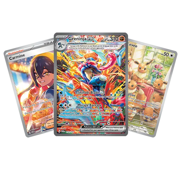 El set Twilight Masquerade incluye increíbles ilustraciones raras especiales como Greninja. Persigue la ilustración rara de Eevee o relájate en el Festival de Kitakami con cualquiera de los entrenadores.