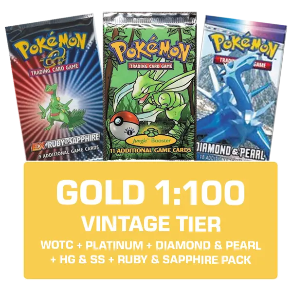 - 1:100 Gold Tier - Vintage Wizards of the Coast (WOTC), Platinum, Diamond & Pearl, Ruby & Sapphire or HeartGold SoulSilver boosterpack