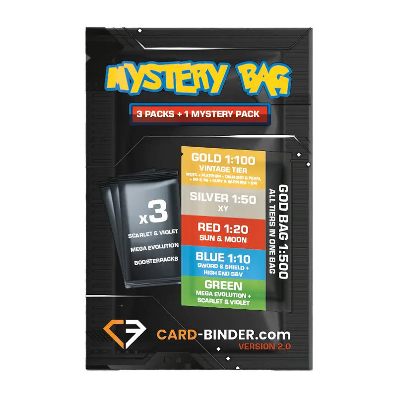 Every Mystery bag contains a variety of 3 Mega Evolution or Scarlet & Violet boosterpacks.